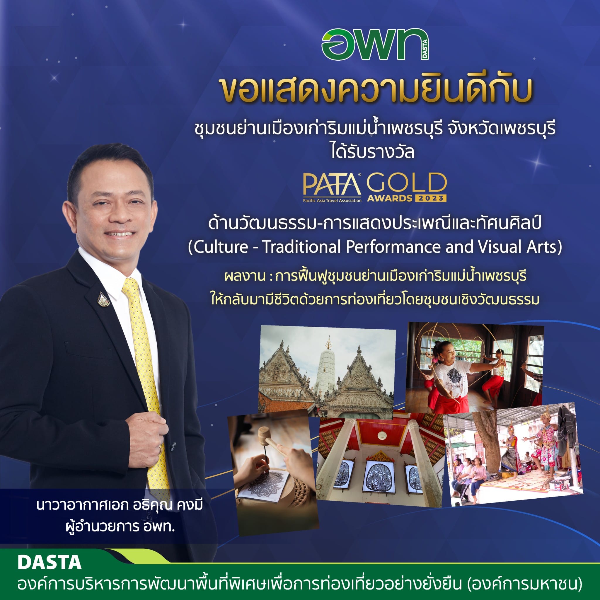 DASTA is pleased to announce that the Old Phetchaburi Town Riverside Community, Phetchaburi Province, was chosen by the Pacific Asia Travel Association (PATA) as the winner of the PATA Gold Award 2023 on Culture - Traditional Performance and Visual Arts from the entry ‘The Revitalization of Old Phetchaburi Town Riverside Community through the Establishment of Cultural Community-based Tourism’.